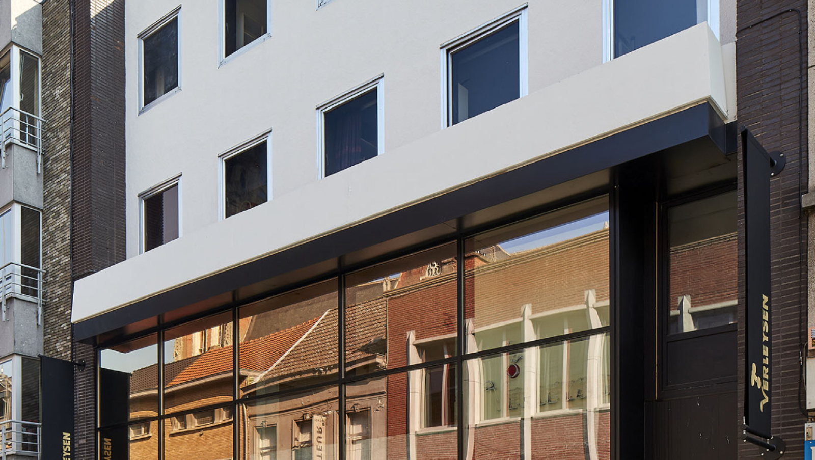 De voorgevel werd in haar totaliteit vernieuwd met een impressiontante glazen raamgevel strekkend over twee verdiepingen. Om dit te realiseren werd één van de bovenliggende appartementen in ruimte verkleind.